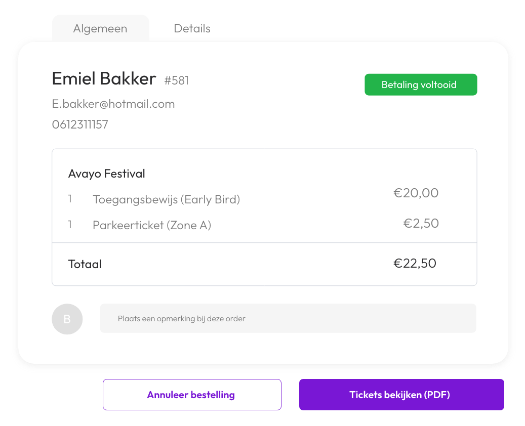 Krijg overzicht met Avayo-Admin! Zie per order de status, ticketaantal, verzonden mails, contactgegevens en veel meer. Voeg notities toe of check of tickets al gescand zijn.