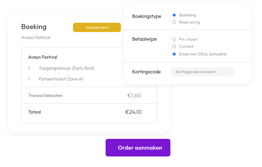 Creëer orders moeiteloos! Naast je online ticketshop kan ook je klantenservice tickets verkopen. Vul de klantgegevens in en rond de betaling af via pin, contant, of stuur een betaallink. Meer hulp, meer verkoop!