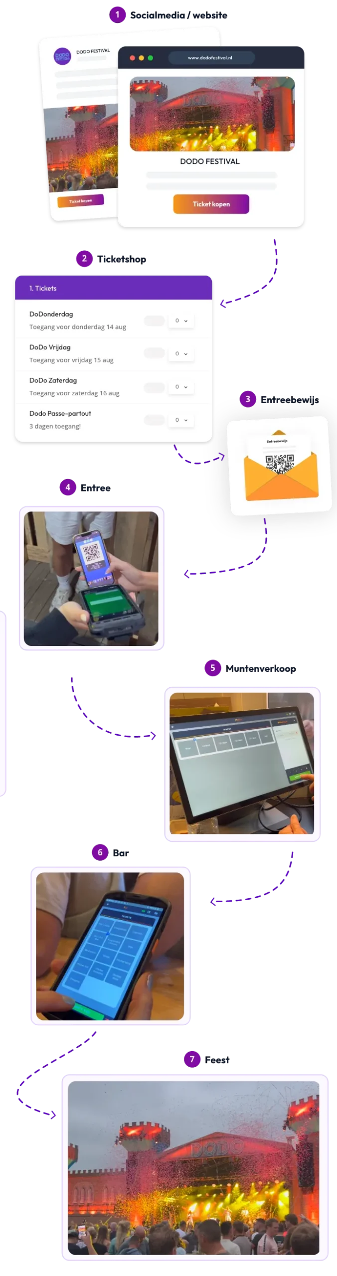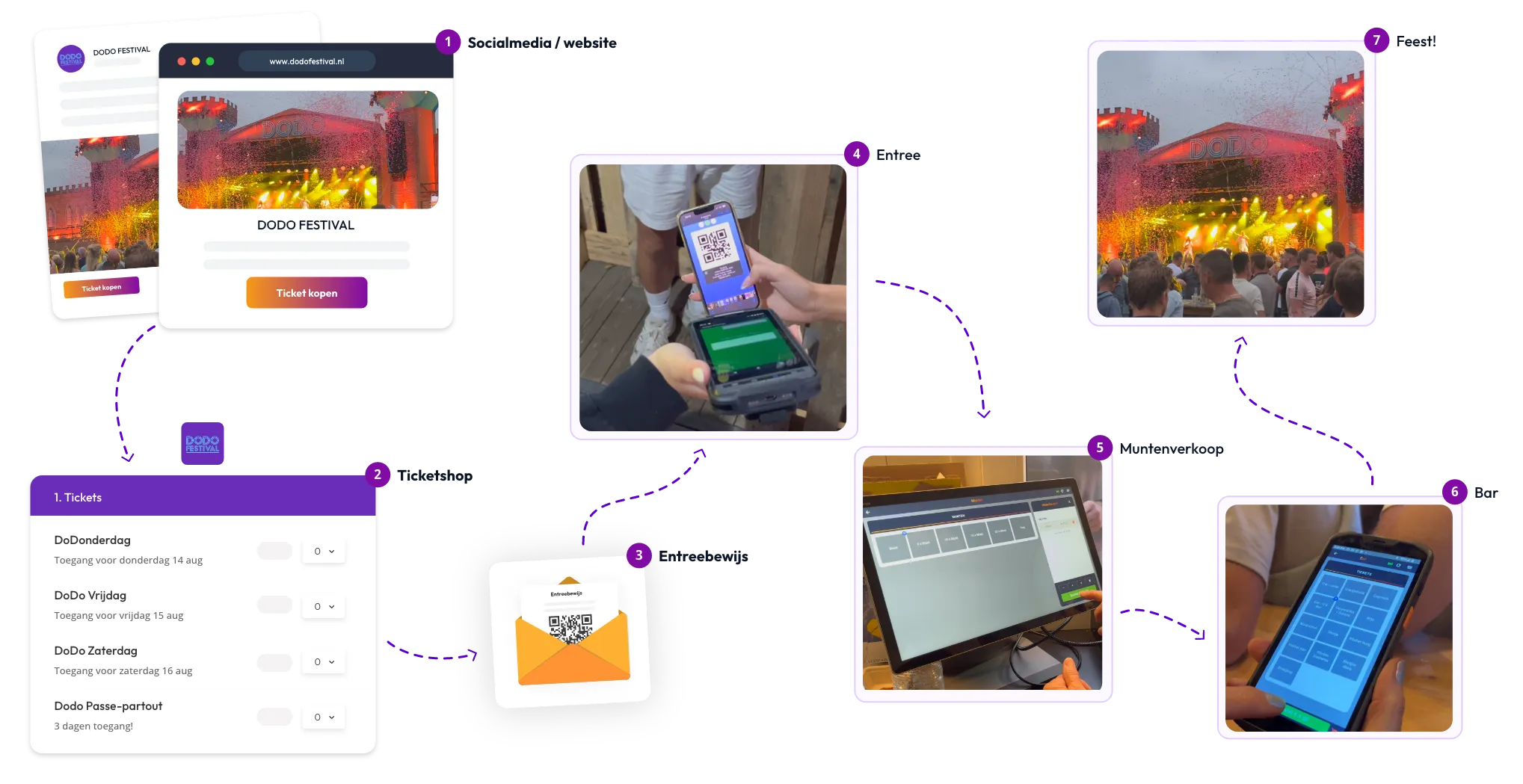 1 Social-media/website → 2 Ticketshop → 3 Entreebewijs → 4 Entree → 5 Muntenverkoop → 6 Bar/Feest 🎉