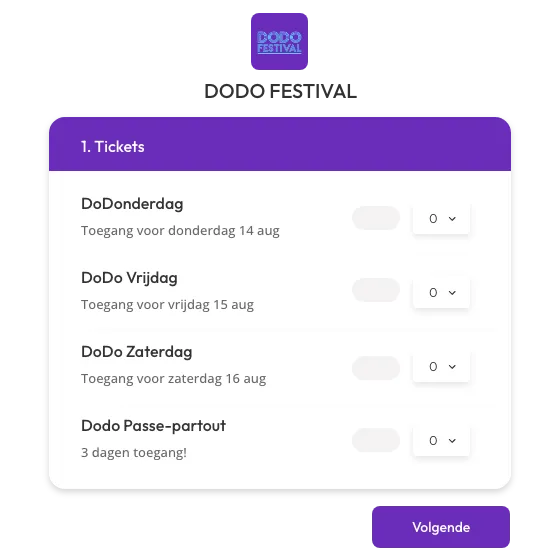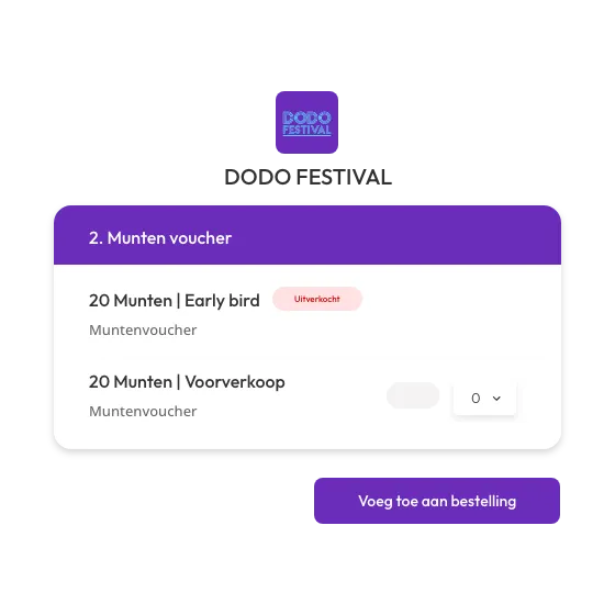 De ticketshop van Dodo Festival is gekoppeld aan hun website en socials. Bezoekers klikken, kopen en hebben direct hun ticket binnen. Eenvoudig geregeld.